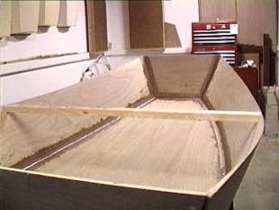 I then proceeded to come up with some designs that would cross the gap between a V-bottomed boat and a pure flat bottomed, Jon style boat. I took the 10ft Nuthatch design and put a 12" wide flat panel down the middle, replacing the single edge with two. This gave the bottom some resistance to oil canning, but not as much as with a true "V". I showed this model to him and explained what I was doing. He said it looked good, but could I widen the flat panel. I said I could and widened it out to 18" and changed the bottom edge of the bow panel to match. Made the model and showed it to him again. Could I make the bottom panel a little wider, for more stability? I said I will try. To widen the bottom panel again I would have to also widen the bow panel again, and it was starting to not be pleasing to my eyes. I was looking at the latest model when I had a light bulb moment. The bottom center panel would come to a point and touch the point on the bow panel. I would then stretch out two bottom side panels that would curve around the front of the bottom center panel, and the same width as the bottom edges of the bow panel. That way I could make the center panel as wide as I needed and the two side panels could be adjusted from that edge to the bottoms of the side panels, and it still looked like a pram from the front. Great, he would be pleased with this new design too.