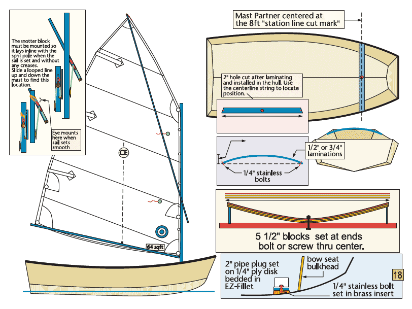 As with all my previous prototype hulls, I have added the sailing option to this design. I do this to make sure that the daggerboard trunk and mast partner are located in the correct locations, and that the hull is a good sailor as designed. If you do not want that option, you can dispense with those instructions and drawing details. I have also added an "alternate" section to the drawing plans for a change in the seating locations, which may be more useful when used with an outboard motor to balance the hull. I have not listed any dimensions, because you may want to modify the locations of the seat positions.