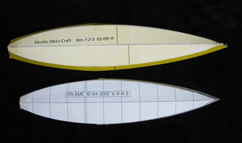 It took me two model hulls to come up with the final design of the scaled down 14ft version that I liked. I actually had the finished model on the first try, but I wanted to change the shape of the transom, so the second model was made. The two halves of this hull, like the 14 foot version, fit on one scarfed sheet of plywood cut down the middle into two equal widths. The shorter 12 foot EMC has almost the same width of the two bottom, and side panels as the 14 footer, but when the hull is wired up, comes in with a narrower beam at 32 inches. I wanted this hull to have the same amount of stability that the bigger version has, and I kept the width of the original bottom panels.