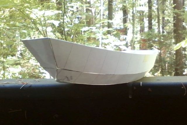 I set out in this design to make the bottom panel as wide as I could without going to the full 48” of the width of the plywood. When you do, you end up with the hard edges I talked about above. That was one of the reasons that the hull has two side panels and the lower one is beveled/angled to the upper sides. This will give the hull some width on the bottom, and as the hull sits lower in the water, the flaring sides will give it more volume the lower it sinks, and also reduces it’s whetted surface too.