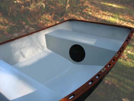 I have gone to using the "enclosed pyramid" (with watertight hatches) style of seating in all my designs for safety reasons. After reading a story with photos, dealing with the deep water self rescue of a brand new "traditional open interior" small boat design, and they couldn't empty out the water; I will no longer include drawings or instructions for old style wooden plank seat interiors. Your safety, and that of your family members is more important to me, than any negative comments about my hull interiors. This hull as designed, has around 5+ cubic feet of extra positive flotation build into the enclosed pyramid seating. That's over 300 pounds of extra support, along with the wood in the hull; and you will have less water to bail out. The two handles or steps on the stern are there to help you or a loved one, get back in the boat again if needed. Always carry and wear, a life jacket adequately sized for you and your guests, and be sure they are in good condition at all times.