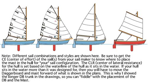 The drawings for this "sailing version" have some changes from what I usually show in my designs. Since this is a larger sailing hull, and not knowing what type/kind of sail(s) you might use; I have changed the length of the Daggerboard Trunk to let you experiment with the placement of your DB. Keep in mind that if you make changes to the sails; you/sail maker will have to determine the location of "that sail(s)" CE (center of effort) and match it up to the CLR (center of lateral resistance) of the hull. The drawings show how to do this and the longer DB truck will let you "tweak" the position of the DB in the hull. You will want a slight weather-helm for control of the hull in most wind conditions.