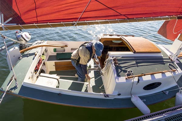 The Great Pelican is stiff and offers a brisk turn of speed to windward. With three full length battens in the standing Lug mainsail, under favorable conditions she will plane an surf along serenely even when larger boats are looking for shelter. This versatile compact cruiser is sturdy and safe - a real winner!