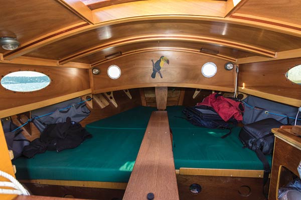 The centerboard weighted with lead is housed in a case equally divided between cockpit and cabin. For single handed sailing or offshore cruising, increased ballast is recommended. This can be installed inboard in the form of plastic water jugs or tanks firmly secured in a frame along the sides of the centerboard.