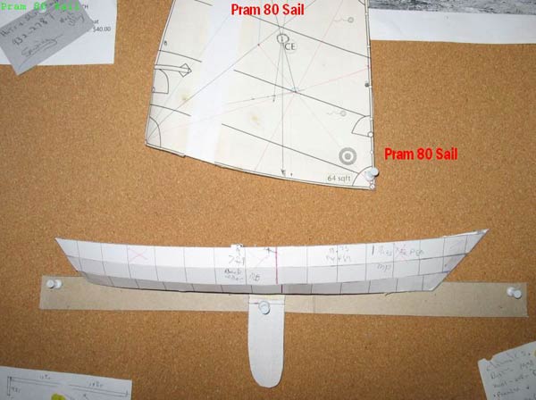 Since this hull is not one of my designs that are mainly used for fishing, I will include all the sailing parts in the build plan set. I will show in the basic drawings, a bow, middle, and stern seat, with a daggerboard trunk, and a normal mast partner for supporting the rig. The Pram 64 square foot Sprit sail from Neil Pryde Sails can be used with this hull; or the new larger Pram 80 sail. I would only recomend the Pram 80 sail if you live in an area with light winds; or you know when to reef the sails in rising winds. The Pram 80 may be a hand full with this narrow hull and a fresh wind. I really like setting up either sail as a gaffer, instead of going with the normal sprit rigging. I find it's easier to raise and drop the sail without the sprit pole, and it's rigging being in the way of the luff sail ties all the time. I can paddle or row away from the dock with the sail completely rigged up and laying in the cockpit, and just pull on the line that raises the sail by the luff, and the one that lifts the gaff pole, to set the sail and I'm off.