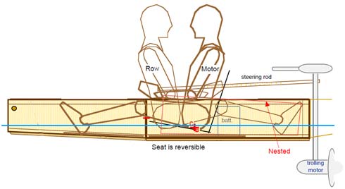 The idea is not new, but the opportunity to build a small boat from 1 sheet of plywood is always intriguing. In this case, I wanted something that was, in this order, stable, easy to row or paddle, low cost, looked like a boat, and would accept a trolling motor for power. I did take the 1 sheet concept to it's limits by utilizing an additional 2' x 4' piece of 12mm ply for the bulkheads and transom. The finished boat will weigh less than 40 pounds, fit in any vehicle, and be robust enough for a 190 pound occupant. An optional extension to the rear module allows for a greater load capacity. As the layout shows, the CB is placed directly below the operator, and the pointed bow provides a smooth, efficient, water entry.