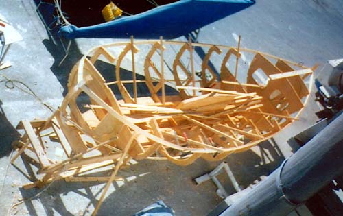 So, after a few months of occasional work at the drawing board, the 6 Metre Whaler emerged as you see here. Based upon the very successful yawl rigged version of the Navigator cruising dinghy, using the same simple plywood lapstrake over web frames and stringers structure. Traditional in her appearance, double ended, with two masts, and with enough sheer to be really pretty, she needs only about NZ $4000.00 worth of materials and about 220 hours of (competent) labor to complete a very nice little whaler which really looks the part.