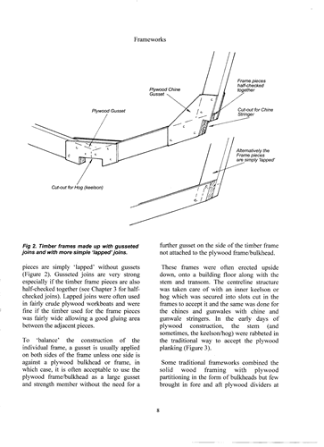 This manual covers the construction of boats using modern ply on frame techniques - the stitch and tape method of construction is fine for boats below 18' or so although I have used it for larger craft, but in larger boats it gets expensive and is not necessarily the easiest method to use. So, for boats over 16 or 18' I tend to use a combination of methods, often based upon a basic framework of slotted ply components - ply frames/bulkheads and fore and aft girders (egg-box construction) and use epoxy only where it is appropriate and cost effective.