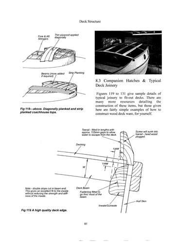 The construction of decks and cabin tops/superstructures is also described using various methods - plywood, strip plank, vertical staving etc and the manual concludes with the various ways in which you can finish your boat - these chapters are also relevant to other forms of hull construction - strip planking, cold moulded etc.