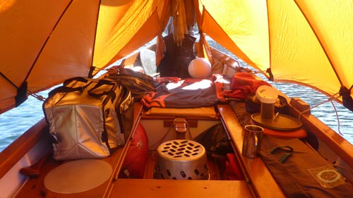 One of the other advantages of a split rig, is that a large boom tent can be setup between the spars. Definitely something that is desirable on our coast where rain is an issue. Small decks, with coamings, fore and aft, were added to deflect any rainwater coming off the tent to keep the crew as dry and snug as possible. Inclement weather can then be waited out quite comfortably without the need to set up camp ashore.