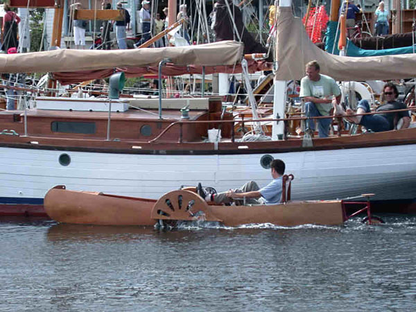 Montgomery uses thin plywood, epoxy and rivets to provide the strong yet lightweight body of the boat. He then takes the parts and pieces from 2 or 3 bicycles along with some custom machined parts to create the drive train and wheels. To keep the splash to a minimum, generously flared fenders drop over the wheels and lend a classic car and paddlewheel riverboat feel to the whole design.