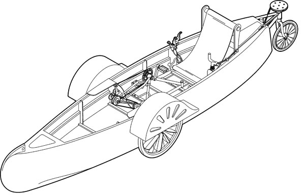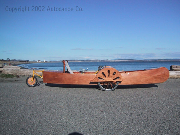 John Montgomery from Port Townsend has designed just such a craft. The Autocanoe is a recumbent bicycle dropped into the body of the canoe. The driver sits back in relative luxury with tiller in hand for navigation on both land water. The wheels have a clever paddle wheel adaptation that provides enough forward thrust in the water, leaving other hand powered canoes behind in his wake.