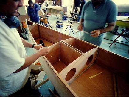 The building process started off with a bang. I spent a long night making up the side and bottom panels and bulkheads. Two days later, David Wilson and I assembled the hull shell in around half an hour! Advantages of the simplified hullshape. David was as startled as I at how fast it had all happened, but dampened my enthusiasm a bit when he christened it "The Hatbox".