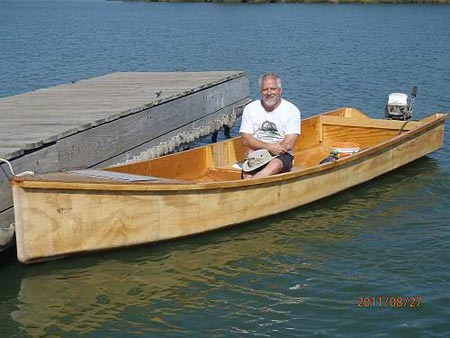 I kept Woobo's light taped seam construction and the plywood bill looks like three sheets of 1/4" and four sheets of 3/8". That's about 250 pounds of plywood and I would expect the finished boat to weigh about that much. The bow is boxed in with a storage/buoyancy chamber, the middle has a stout boxed thwart, and the stern is boxed in with a draining motor well. There are actually two places in the boat long and wide enough to lie down in. It might be a reasonable expedition boat given a small motor that burns little fuel and a canoeist skipper who is used to roughing it.