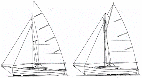 The gaff and marconi mainsails are both of the same area and have roach and battens, for light air efficiency. They are fitted with two rows of reefing so that they can be snugged down for heavier conditions. Sheeting is through a 5:1 tackle system fitted to the top of the transom, and a boomvang to the base of the tabernacle helps to control mainsail twist.