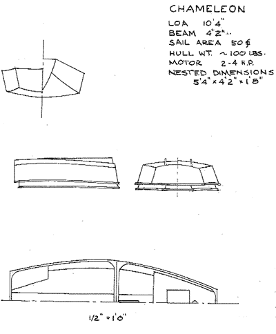 TWO BITS was about 9-1/2 feet long, 4 feet wide, and stowed in five feet of length. She served me well, and I sold hundreds of sets of plans for her. Over the years, I experimented with various other dimensions, hull shapes and construction details. I tried boats up to 16 feet in length and with two and three nesting pieces. Some towed beautifully, some sailed very well, some towed well, some were stable, some handled rough weather easily, some were light and compact to stow and some were very easy to build. None, however, combined these qualities in a way that satisfied me, until CHAMELEON.