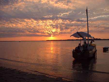 For our last two days we gave up the shallow-water life and sailed from P-town down to Wellfleet, about 7 miles, surfing along on gentle 3-foot waves with a following wind. We beached the boat at Great Island, walked the beach, had a picnic dinner, swam and played, spent the night, and left the next morning at 6 a.m. to beat the falling tide. Our weather radio mysteriously quit working that morning, so all we had was the prior day's forecast of 10-15 knot winds from the SW.
