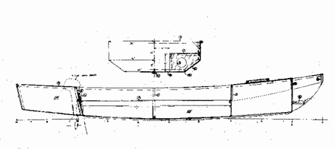 Dani Jay has its motor in a slot in the stern, almost an inboard well. I've drawn such a thing before but that boat was never built. I have stayed away from inboard wells mostly because Phil Bolger, who knows all, hates them so much after having used such boats. Well, I just don't know about that but i do know the Dani Jay man wanted the well very much. It puts the motor right at hand at the back of the cockpit. The well takes up a lot more room than you might expect and Dani Jay is in some respects a 16' boat with a couple of narrow 4' sponsons on her stern. I measured up a few of my own motors and saw the motor slot needs to be a full 2' wide to allow for a full turn and of course nothing can be behind it if you hope to raise it up in the usual way. Phil's argument is that also you have noise, smoke and water surge to deal with. Having the slot open in the stern will keep the water from "pumping up" inside the well. And the motor must be a long shaft to keep waves from surging up into the well and over the "transom' which in this case is an interior bulkhead slanted 15 degrees. I don't think noise will be an issue at all - the only motor to use with something like this is a 5 hp job, 4 stroke if you can afford it. That should push it at full speed at about half throttle. If you use a smaller motor you will be tempted to run it at full bore a lot, and if you use more you will be tempted to overspeed the boat a lot. But a hull like this will not be oversped. It will just dig a deeper hole in the water and make a bigger wake. Last summer I was lucky enough to get a long ride on Paul Effrit's very modified Selway boat which was set up like Dani Jay. As he motored along I lifted the hood and saw there was no evidence of water pumping up or surging inside his well which was also an open slot to the stern. The noise and smoke of his modern 4 stroke was nothing. And full throttle just gave us a huge wake. I am quite confident it will work well if the power is just right. It won't work well if the power is wrong.