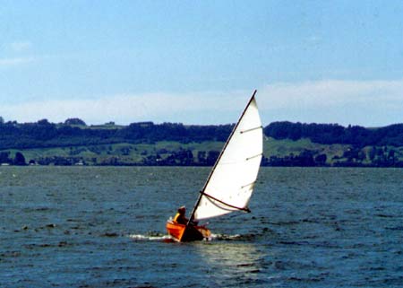 Twelve year old Daniel had pretty much outgrown his Stuart Reid designed miniature flat bottomed skiff, and father Wayne Chittenden had arranged to stay with me over one Christmas to do a spot of boat building. Wayne wanted to build himself one of my light surf dories and had also asked if I could design a replacement for Daniel's skiff. The brief was straightforward enough - they needed a sailing dinghy light enough to roof rack or for a youngster to drag up the beach. Big enough to take three adults sailing, or five when rowing so she could double as a yacht or launch tender.