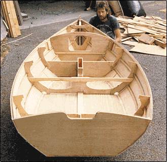 She was to be seaworthy enough to cope with the four mile passage across to the grandparents place on Waiheke Island and fast enough to be worth sailing in the kid's classes at the annual Waiheke regatta and last but not least she had to be built on the thinnest of budgets! By the time my guests arrived I had a preliminary sketch on paper, based on previous boats similar but larger. I gave her more flare than her bigger sisters to keep the lightweight crew out where the weight would do the most good, lots of freeboard and a cutout for an outboard motor. The area under the foredeck provides a capacious locker for camping gear as well as adding to the buoyancy tanks under the seats. I gave her an underwater shape that would allow her to plane when lightly loaded, ample sail area and reef points for sailing on "those" days. Wayne and Dan flew into the building and made rapid progress. I dashed out to the workshop several times a day with more drawings as the previous parts were completed and the piles of scrap and sawdust grew as the two boats took shape.