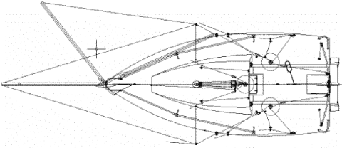The deck layout is a fairly conventional 3-winch arrangement. The smaller headsails sheet to the top of the cabin and are led to the cabintop winch. The larger headsails and spinnakers sheet to the cockpit winches. Tweeker lines replace headsail tracks.