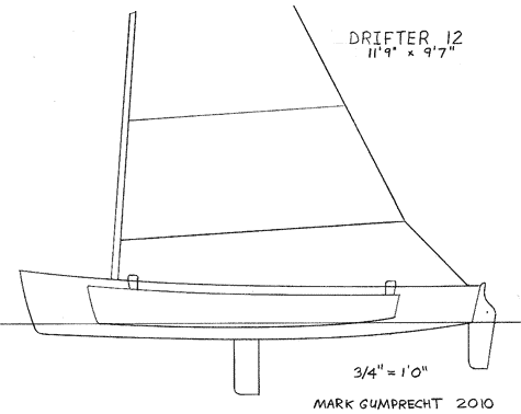 The Drifter 12 is a small trimaran that can be paddled or sailed, and is perfect for exploring rivers, bays, and lakes. The rig is simple, using a windsurfing mast. The sail rolls up and is reefable to any size in seconds. The boat is steered with rudder pedals, so your hands are always free. The amas fit inside the mail hull, making the boat very compact for storage and transport. The Drifter can be car-topped or carried on a small trailer, and it takes about 15 minutes to assemble. It is very stable and easy to sail, tacks well, and is quite fast--great for kids or anyone who is learning how to sail. The boat is easy to build out of plywood, weighing about 100 lbs when assembled.