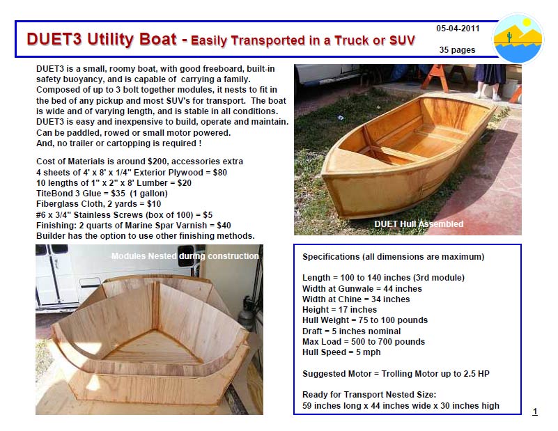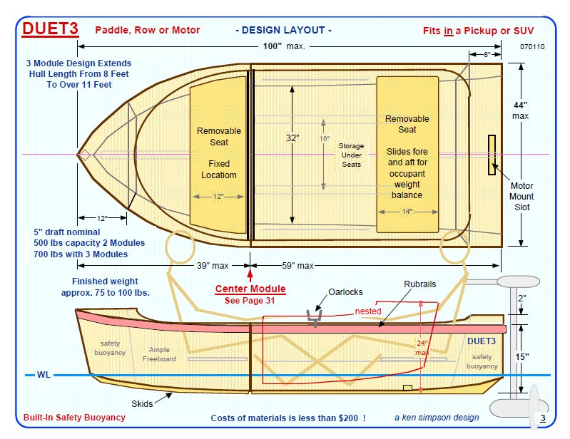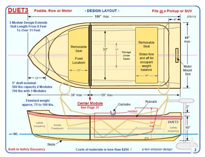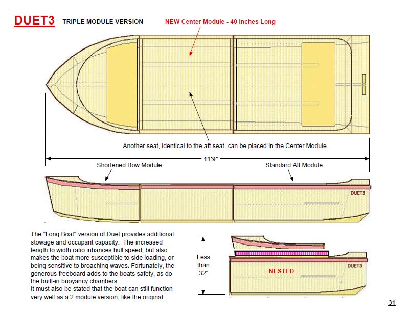 DUET 3 Utility Boat - A two or three module transportable that has the capacity to hold a small family. With built-in safety buoyancy and generous freeboard, it can provide great family fun. Easy to build and assemble at the water, it fits in all trucks and suv's, no trailer required. With a 500 pound capacity and ample storage, it also makes a great fishing boat or tender, easily handled by a single person.