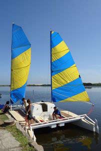 As for my other designs the beams are standard Aluminum tubes. These are connected with stainless steel clamps to the hulls. Setting up the boat will take about 2 hours. The most time will be needed to stretch the trampolines. On the trailer the boat stays in the legal limit of 2,44 m (8 feet) width.As mentioned earlier the boat is, as all my designs a ply(wood)/glass/Epoxy composite construction. Still the most cost efficient to build a light and strong and almost maintenance free boat. One of the best parts of the system is that you as amateur can check your work thoroughly to give you confidence in your work and later at sea.