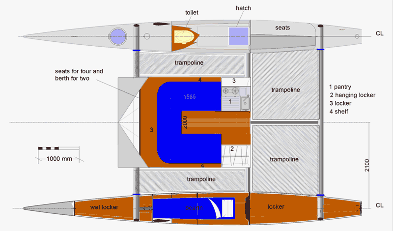 The settee in the nacelle is 2 m wide and 1,565 m deep. Over the day a roomy settee for up to six persons at night a comfortable double berth. There is a lot of half height lockers. Because of this the room looks bigger as it is. The hanging locker can be omitted, perhaps for a chard table. There is an other hanging locker in the starboard hull. The height in the nacelle is from 1,4m at the entrance to the minimum height of 0,98 m above the seats in the front.