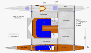 Each hull sports a cockpit. Each cockpit has also a tiller. Because of the cockpits I propose to use only trampolines in between the hulls. The lay out shows no front trampoline. But there are drawings for a front beam and connectors in the drawing set.