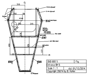 The hulls have a trapezoidal cross section. I use this shape a lot. The boats are fast, because of the relative low whetted surface. If correct designed the do not pound. The entrance is a tulip shaped V. Which means much dynamic lift on the bows. The never dive! I chose dagger boards this time. I dit this because this will be a very fast boat. So the apparent wind angle changes quickly forward. The boat sails on the wind. To take the most profit a low leeway angle is important and dagger boards the best means to accomplish this. The plans show a way how to build them the easy way. (See also this article).