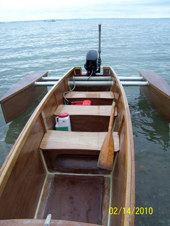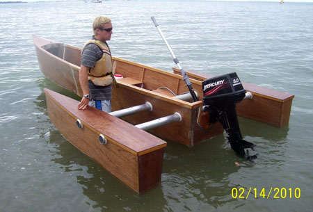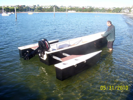 Plans will be available very soon, and I will also have more data available on fuel economy and speed once more testing is complete. Currently the boat can achieve a top speed of 13 knots with an 8hp outboard motor. 11.8 knots was achieved with 2 people aboard, and just under 10 knots with 3 people aboard.