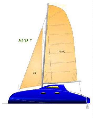 Construction and design: The ECO 7.5 is a multi chine design. Like all our designs the boat is of plywood/glass/Epoxy construction. The headroom in the hulls is from 1.92m to 1.82m where it counts. The seat height around the table is at least 98 cm. Big storage areas (inside and outside) make the boat a perfect one for extended vacations.
