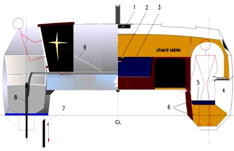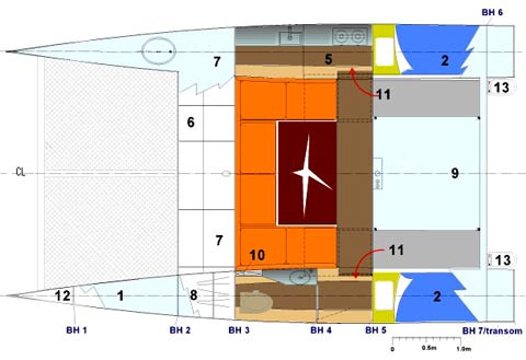 | 3 Settee/double bunk | 8 Dagger board rudder |