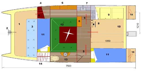 | 1 Forward cockpit | 6 locker | 11 berth |