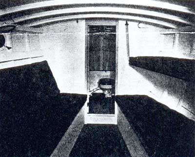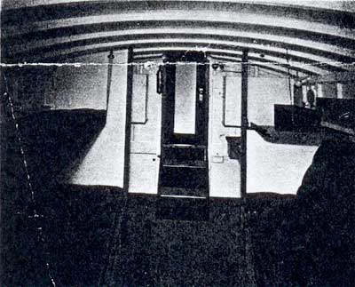 The cockpit is unusually large and is protected by a khaki awning and windshield. The ice box is located in the forward port corner convenient to the galley and where it does not infringe on useful space. The spark and throttle and reverse controls of special Elco type are centered at the wheel which is located on the starboard side.