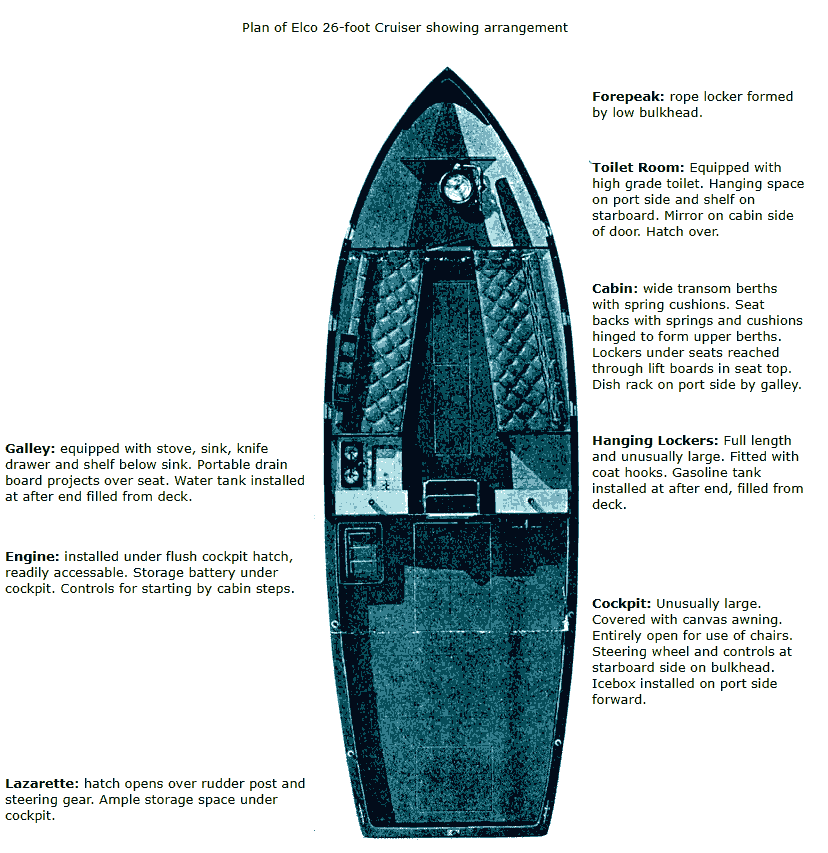 The 26-foot Elco Cruiser, first presented to the public early in 1925, now has the enthusiastic recommendation of nearly two hundred owners. Two years of service as a day boat, fisherman, sailboat tender, in the Navy of a foreign power, and in coastwise cruising