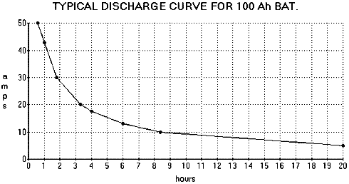 Now let's guess at the endurance. The 24 volt motor running at 1 hp should use 750/24 = 31 amps per hour. The six batteries in the plan are like the 12v, 100 amp-hour battery shown in the above chart (power-wise, they are 12x100=1200 watt-hours each for a total of 7200 watt-hours for the six). They must be first wired two in series to produce three 24 volt sources. So in use they will look like three 24 volt batteries, 100 amp-hours each.