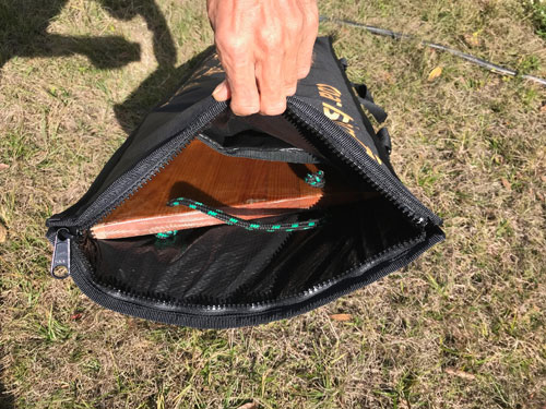 Inside the bag there are two compartments. One for the Centreboard and one for the rudder blade. The outside of the bag is padded with a resilient closed cell foam.