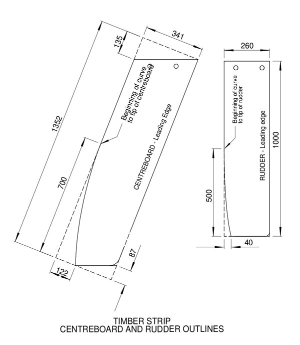 There is a drawing of the standard centreboard and rudder below. Please make sure your centreboard and rudder are close to these overall dimensions. They can be slightly oversize by a few millimetres.