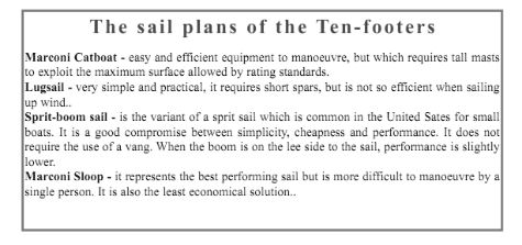 When it showed up for the sailing race, its very unusual shape evoked quite a few ironic comments and various comparisons with other objects which have nothing to do with boats: the closest comparison, I believe, is that of an old blotter, used in the past with blotting paper to absorb ink. Comments, however, died out immediately after the excellent performance of the GIORMAX in the water: it was the fastest among the Ten-footers in sailing close to the wind and, with following wind, only a trimaran was able to reach it. While I was not particularly surprised by this performance, because a narrow boat, which by heeling reduces even further its water plane and places the chine in the water for all of its length, was bound to be fast, I was a little somewhat dubious about comfort and stability which, on the contrary, turned out to be much greater than I had expected. Whether sitting in the cockpit or on the side of the boat, it is quite comfortable and stability is more than sufficient: to capsize you need to make a very serious mistake in manoeuvring. The sail surface is that of the FARO' with an increased main sail surface, up to 7 sq. m. A main sail larger by a square meter, to the rating limit, would give it more speed, but obviously, makes the boat more difficult to control with strong winds. The boat is very easy to control and thanks to its limited weight, it is also easy to handle on the shore.