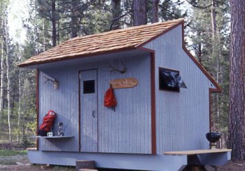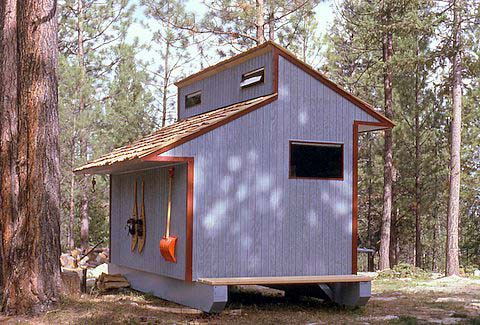 For about $1000 a first class version can be built, and about half that amount for an economy version. It can be built to take-apart if necessary, constructed in a back yard and re-assembled on site in the woods. The 8' by 12' floorplan plus sleeping/storage loft overhead provide about 140 square feet of usable space. Hollow plywood skid-beams provide structural support and also elevate the cabin above snow, or can be propped level about rough ground. Roof overhangs provide cover for stacked wood, boats, etc.