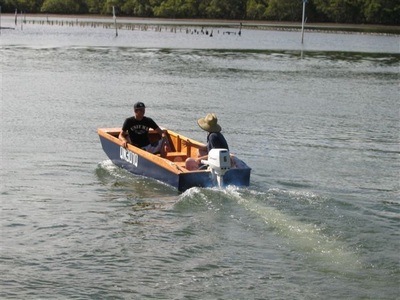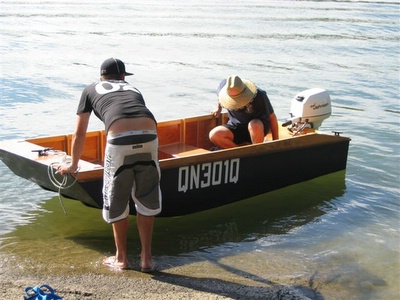 When I drew the plans up I made the transom strong enough to handle a 15hp outboard. The first few launched used modest powerplants of 6 to 8hp which she handles very nicely. Lower power (5hp) is OK if there is only one person and a light payload - maybe a child and some fishing gear and the intention is to chug along.