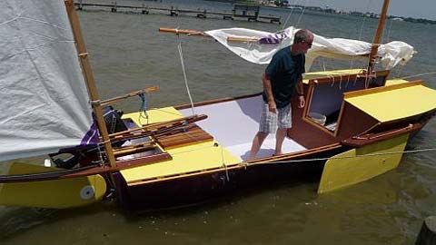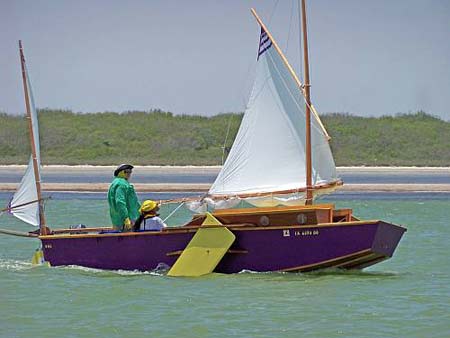 John took her out on a few short shakedown runs and then immediately into the Texas200 for which she was designed. He crewed for his wife Rosa. They camped in the boat at the stops. He reported no severe problems although he said she had stout weather helm until he rerigged the main further forward. Now, I drew the rig to balance well without the mizzen so this is not too much surprize, especially in the strong winds of the TX200 where the main is always reefed but the mizzen is not. To add to this I believe his mizzen is mounted on his new transom extension 18" aft of the original mizzen location which would add to the weather helm. But not to worry. These rigs are very easy to adjust and a quick and permanent fix, if needed, might be to adjust the rake of the mast by moving the mast partner, which simply bolts to the deck slot beam, forward as required. Anyway, that is how I look at it now. I would not be too quick to change it until I also sailed her in light winds since high winds almost always add to weather helm. Also, in the strong TX200 winds with the boat going hull speed all the time he found the sink weight in the rudder to be too small, with the result that the rudder would not hang vertically and instead would slant back a bit. That increases the helm forces which could be quite tiring given 40 mile legs of the TX200. So maybe the rudder could stand more lead, or maybe the sails adjusted to remove the helm force. Here are a few photos. You can see that the extra stern extension adds a lot to the boat.