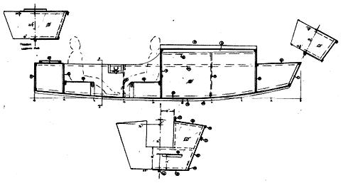One thing I goofed on maybe in Hapscut was that I did not draw a motor well as I did with Laguna. I know if I were building one of these for myself I would have it. Extend the stern back another 18" with the open well ending with a transom angled 15 degrees. Then you could easily mount a motor and store a lot of messy gear back there. The motor sounds like cheating but it can save you butt on occasions and in general you can cover a lot more water even if you seldom use it because you won't play light winds so cautiously. But I don't know if a motor can save your butt in really rough going.