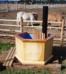 ....I built your rectangular tub last year and the kids took it over so now I'm going to do the hex tub for myself. I like the portability of these tubs, and so do the kids. The wood burning heater works OK but I also rigged a hose from the house water heater so I can fill it hot in a few minutes, then I keep it hot with the wood burner. I saw one of your hot tubs in Popular Science about 10 years ago and I'm finally building it. Loren. Gabriola Island, BC, Canada