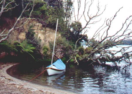 The wait was worthwhile though, she got finished in Gordon Newcombes (Plywood and Marine Supplies, the best plywood shop around) showroom, Derek Hickman made me an excellent sail, and she was eventually launched into the fresh water of Lake Rotoiti.