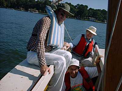 While I was sailing with Gerry, Bob's boat came out on the lake with four adult males and no sign of bogging down, showing that these fat pram shapes, very much like my Piccup Pram, can handle a lot of weight in the 13.5' length. Here are three of the pirates plus another who was taking the picture.
