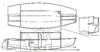 IMB has an 8' long cabin on a multichine pram hull. The prototype was built to perfection by Gerry Scott of Cleveland, Texas. At the Conroe (Houston) messabout I got a chance to look over his boat plus the only other IMB I know of built by Bob Williams. Both boats were quite true to the plans. Both had added low inside seats which made them more pleasant to use to the point that I will show some seats on the plans. I was worried when I drew IMB that the headroom would be minimal so drew no seats thinking the crew would sit on the floor, as with the original Birdwatcher.