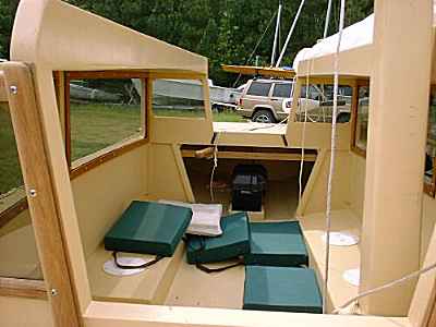These are usually cool inside. The tinted windows cut the sun's power. The crew can sit in the shade of the deck. Downdraft from the sail cascades through the walkway. (By the way, at the Conroe messabout two boaters with Lexan windows noted that mosquito spray will ruin Lexan with one application and they noted belatedly that the back of the spray can says so.)